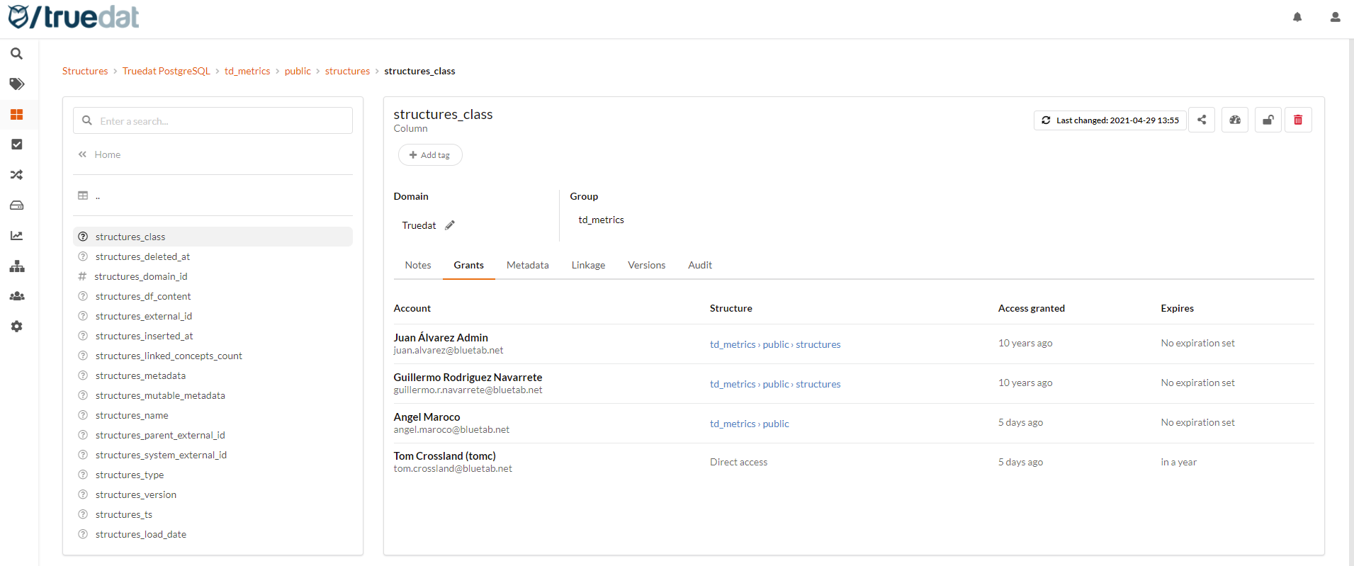 Using integration pieces we will be able to document in Truedat the users that have access a certain structures. This will allow a user to see to which structures he/she has been granted access.