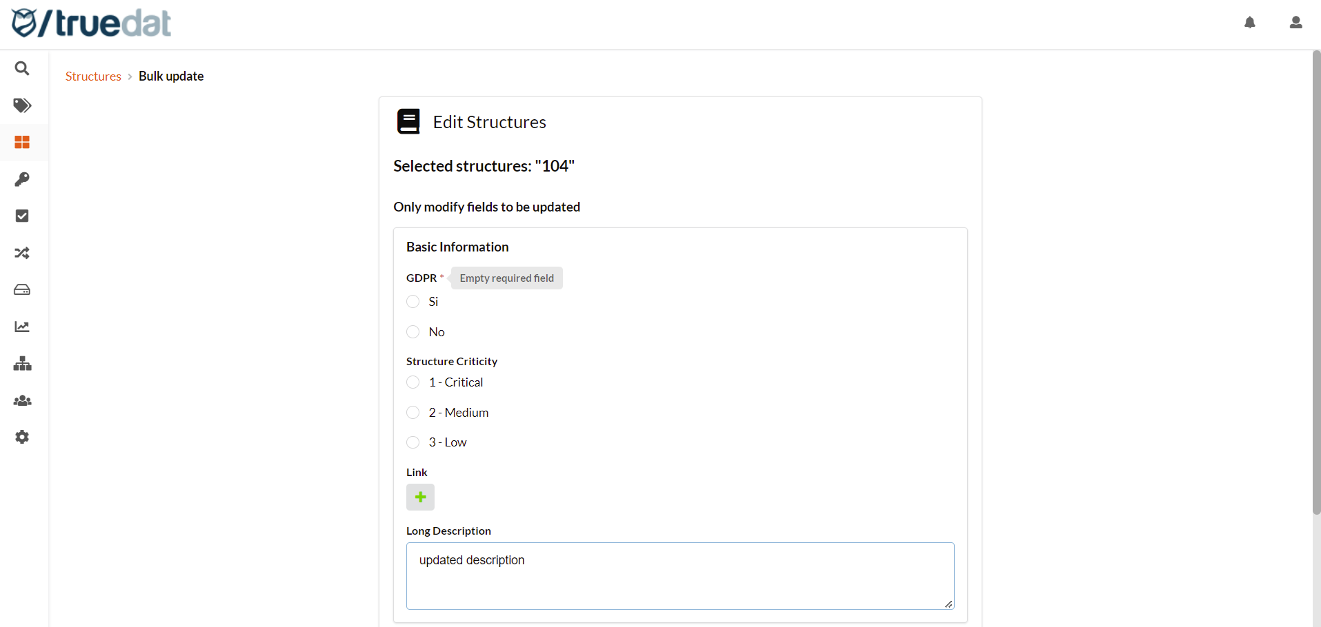 All fields are optional and only those for which a value is entered will be updated on the structure. All the fields of the template / type by which it has been filtered will appear.