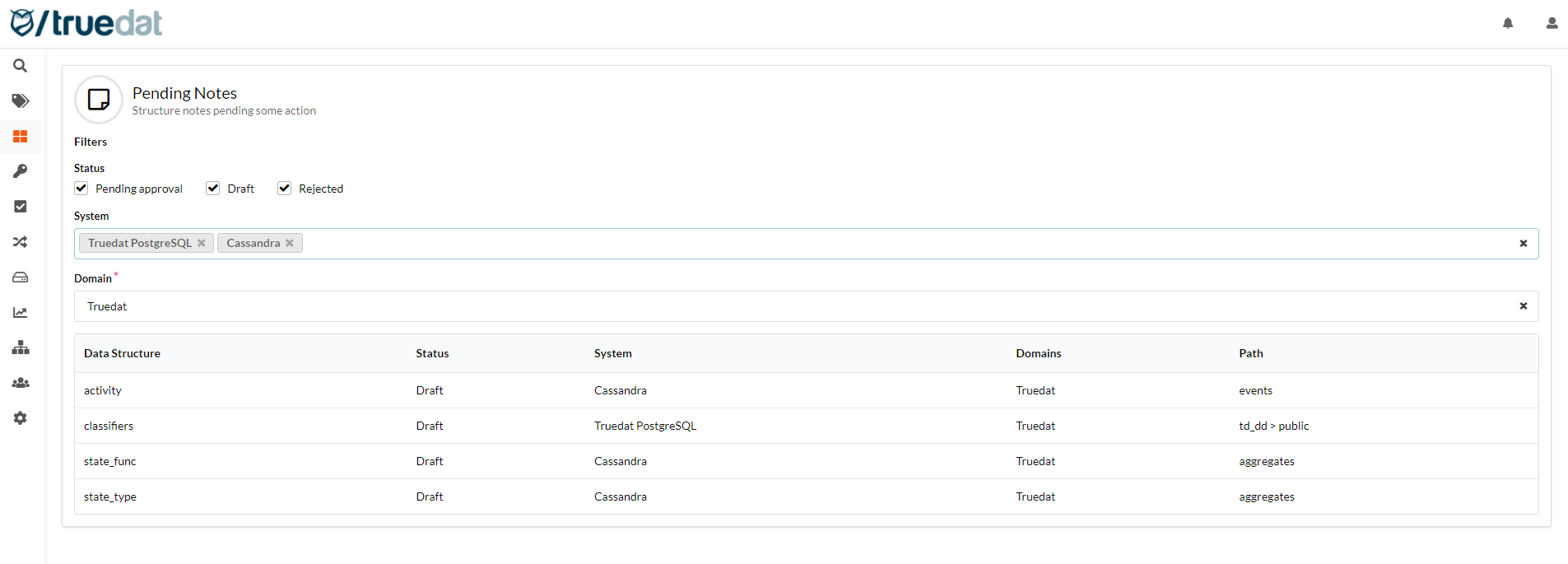 In the Data Catalog there is a new menu option to view the structure notes that are not published yet. These menu option will be visible to those users with permissions to manage notes (edit, send for approval, publish or reject) and they will view notes pending an action from them which will depend on their permissions, i.e. if the user has permission to publish/reject notes they will see notes pending approval but if the user only has permission to publish, the notes displayed will be only those in draft status.