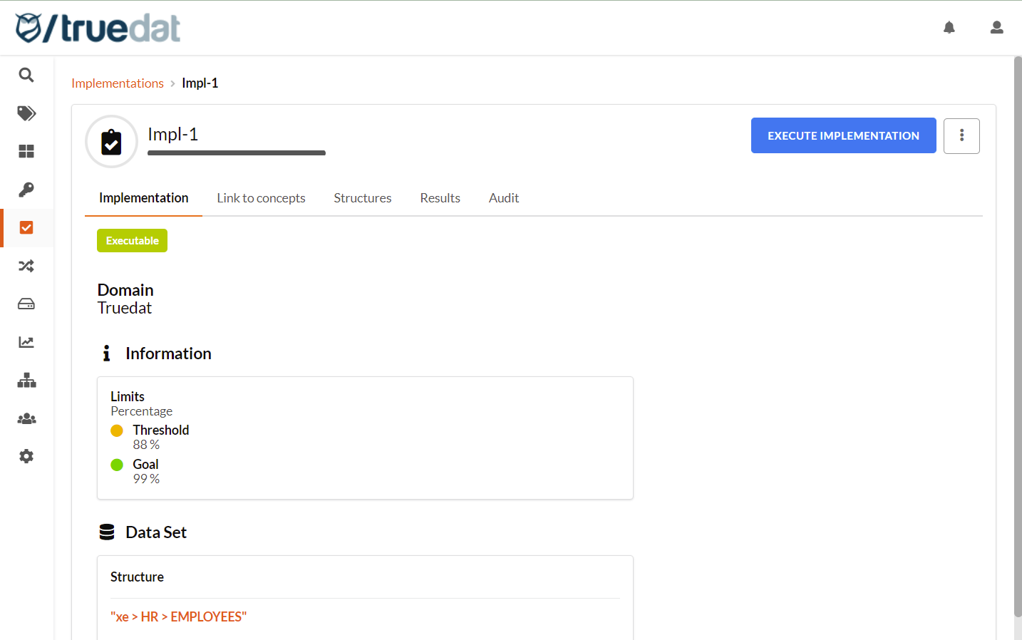 Quality Implementations can be created without having to link them to a functional quality rule. Truedat will support both models: having quality implementations linked to a quality rule, and standalone quality implementations. However, initially, in each installation only one model will be supported, either implementations with rules or without rules. In a future release it will be possible that both models co-exist in Truedat so in an installation you will be able to have implementations of both types: linked to a rule and standalone.