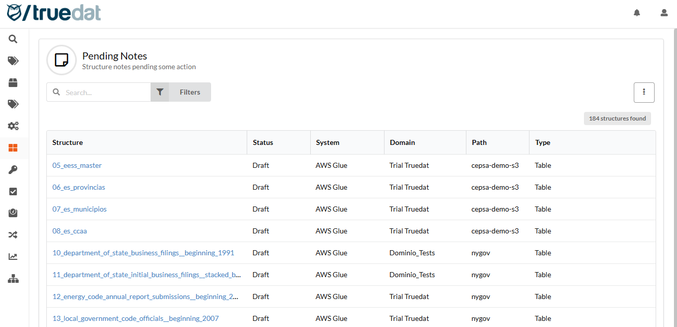 Filtering: You will be able to filter using information discovered from the data source and aditional information documented in your installation using the data catalog templates. In order to filter by technical metadata fields, these need to be configured by an admin user in structure types screen. Some filter examples: structure type, last changed date, linked to business concept, with/without extra information (notes or functional metadata).