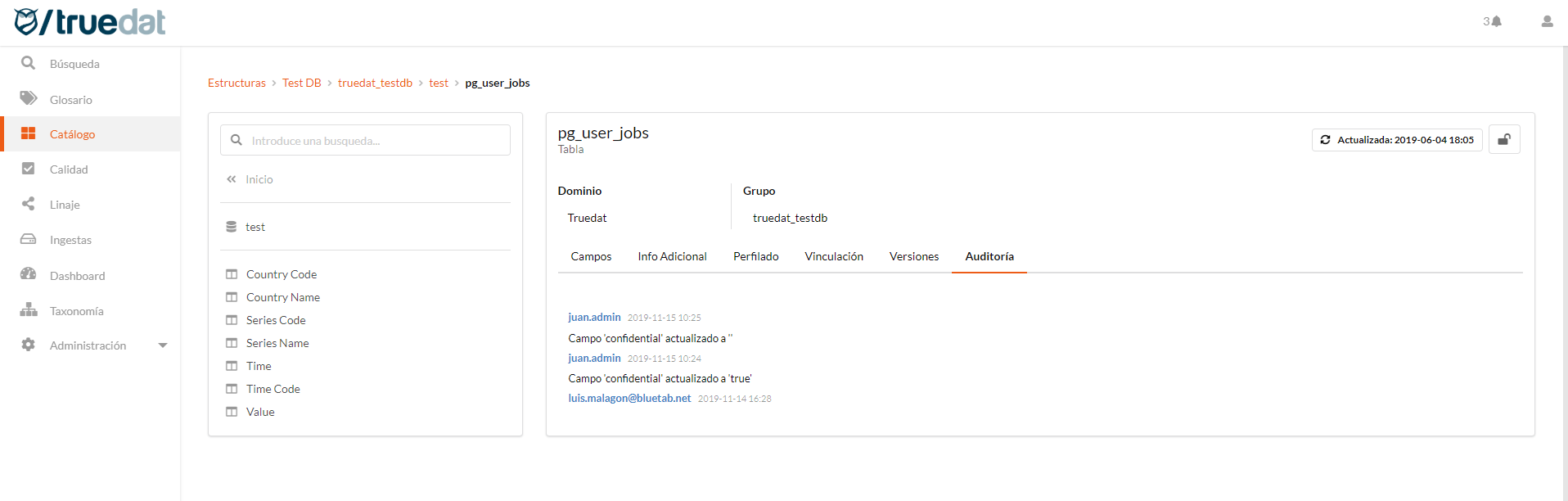 This module allows the consultation and enrichment of metadata obtained from the organization's systems. For this, search, filtering and browsing options are provided through the catalog. Additionally, this module connects with both the glossary of concepts and the data quality glossary to allow navigation between the different modules.