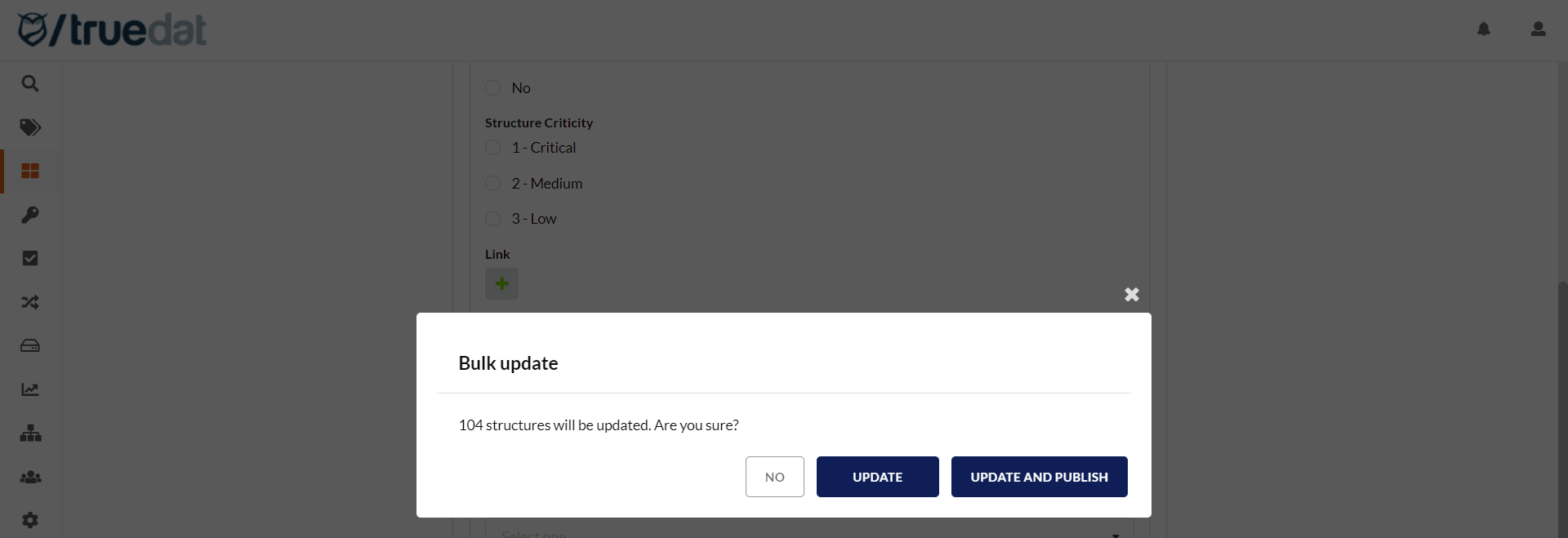 Once the fields to be updated are filled in and when we press the "Save" button we will be asked for confirmation to carry out the update, informing us of the number of structures to be updated. There are 2 options: update the notes and leave them in Draft status so they will have to be published later or update and leave the notes alreadyin Published status.
