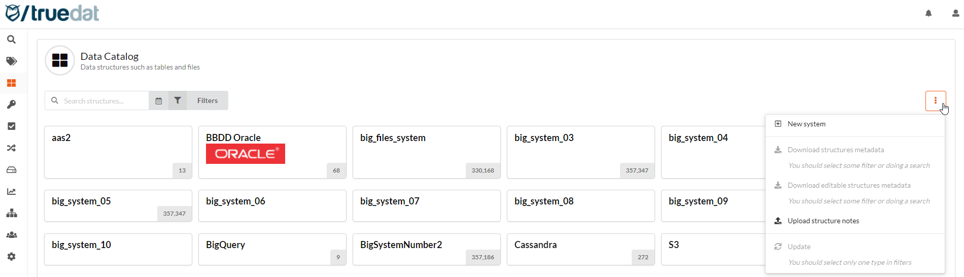 When accessing the Catalog we will obtain a list of the available systems, showing for each one of them the volume of structures that have been imported as well as the count by type of structures when hovering over the number.