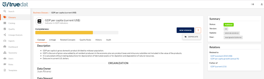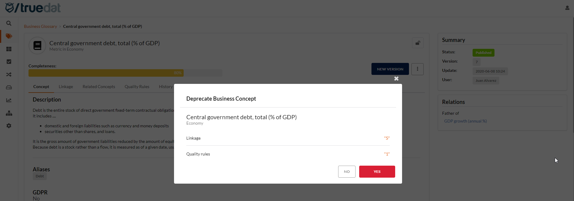 Clicking "Archive" will remove the business concept to remove it from the list of published concepts. This option is used when a published term is no longer used, but it has been previously published and therefore it is not allowed to completely remove it from the system. The application will notify us if the concept that we are going to archive had related information (links and quality rules).