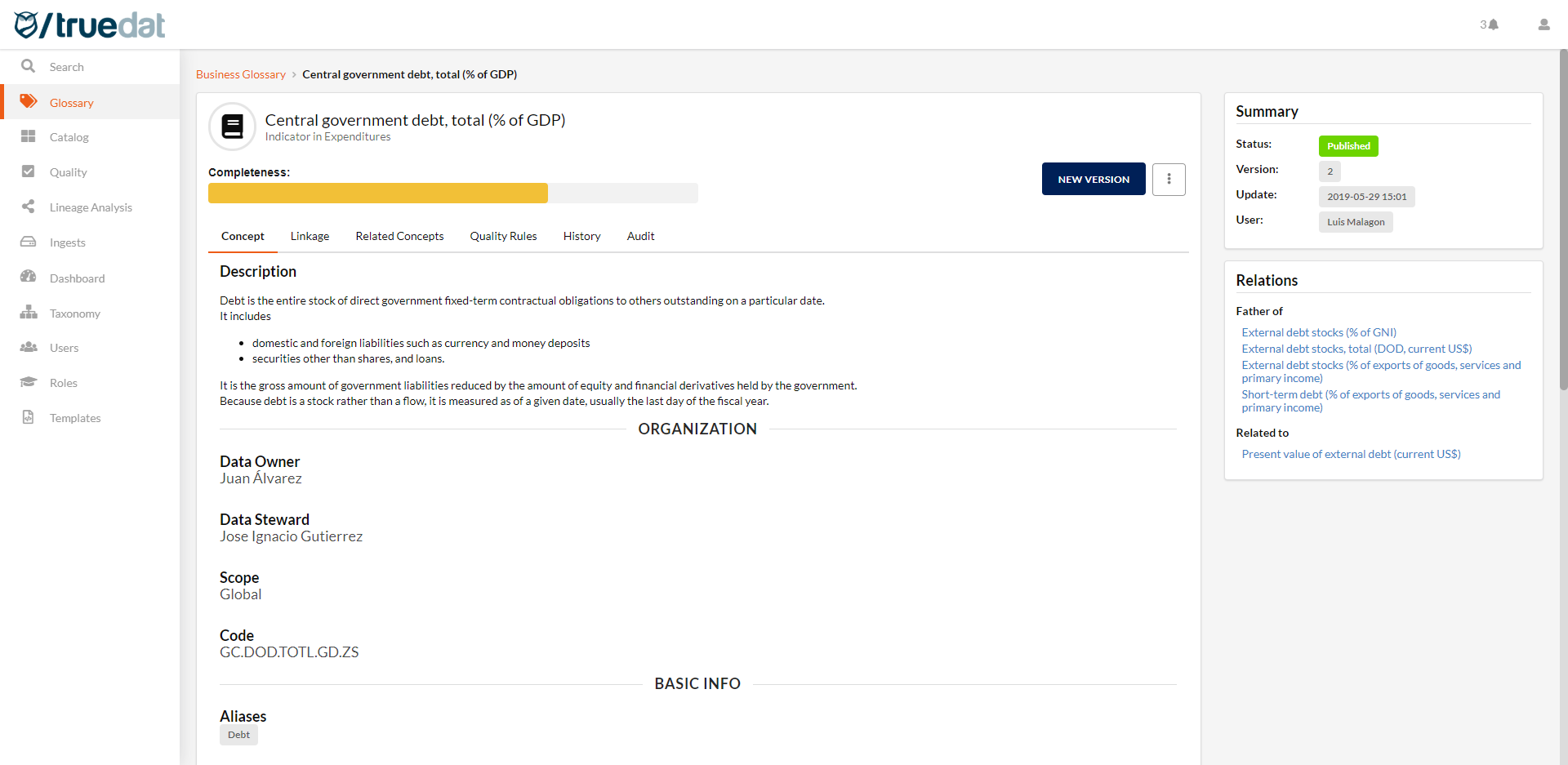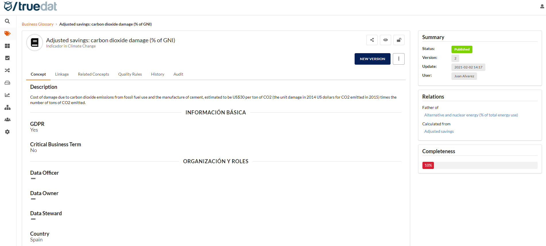 The template may include some additional fields that although not mandatory to be able to publish the concept, they are desirable to have a complete definition of the business concept. Only those concepts where all the mandatory and optional fields are filled in will be shown as 100% completed.