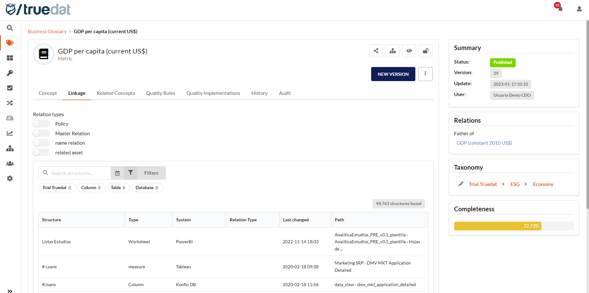 Links of the business concept to the metadata contained in the Data Catalog are displayed in the tab.