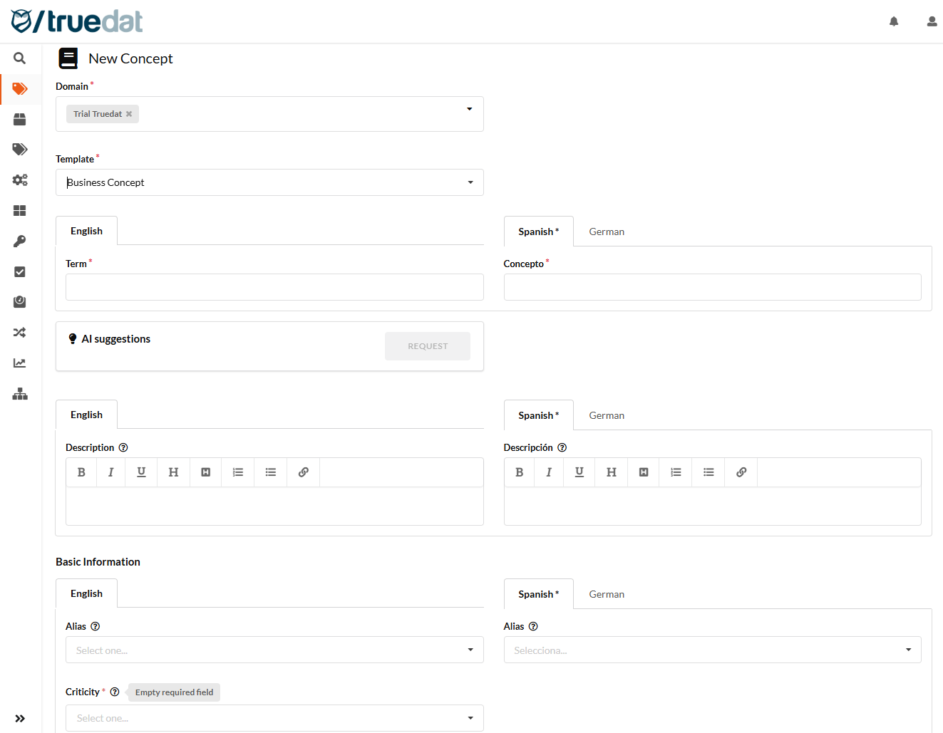If you have several languages set up in Truedat, you will have to complete the concept form in all the languages that have been marked as required. Fields with a fixed set of values will be automatically populated and will use the translations that must have been defined by an Administrator in the Languages module.