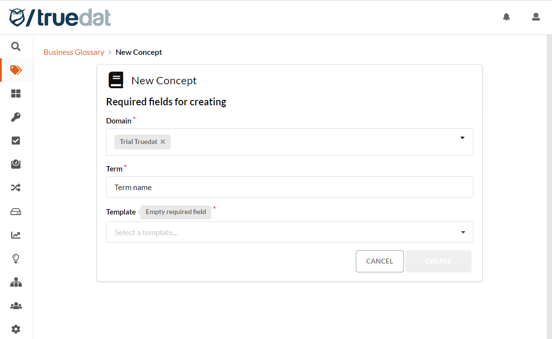 In order to create a new concept you will have to provide the name and the domain and any field from the template that is required.