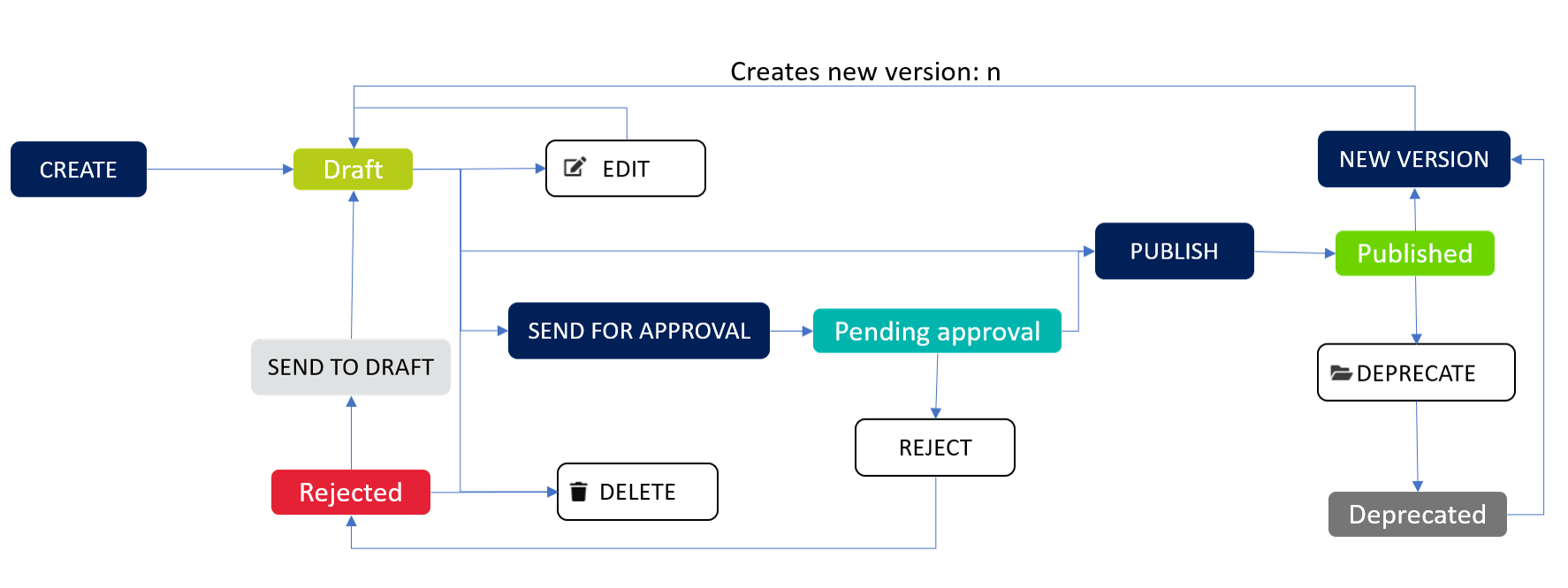 Users will be able to perform different actions depending on permission and note status using following workflow to manage structures notes and depending on user permissions.