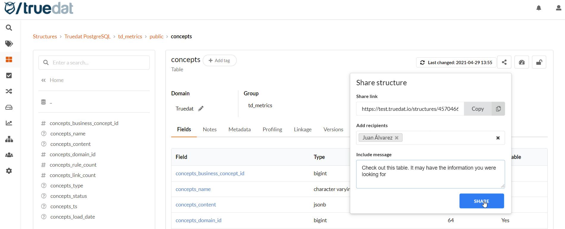 When metadata are loaded into truedat, a domain is assigned by the connector as specified in the data source. In the data catalog you will be able to reassign the domain of a specific data structure or assign it to more than one domain. This is specially important if you are planning to manage different permissions to data structures depending on the data domain the are assigned to. When changing the domain of a structure you will have the option to automatically change the domain of all its children.