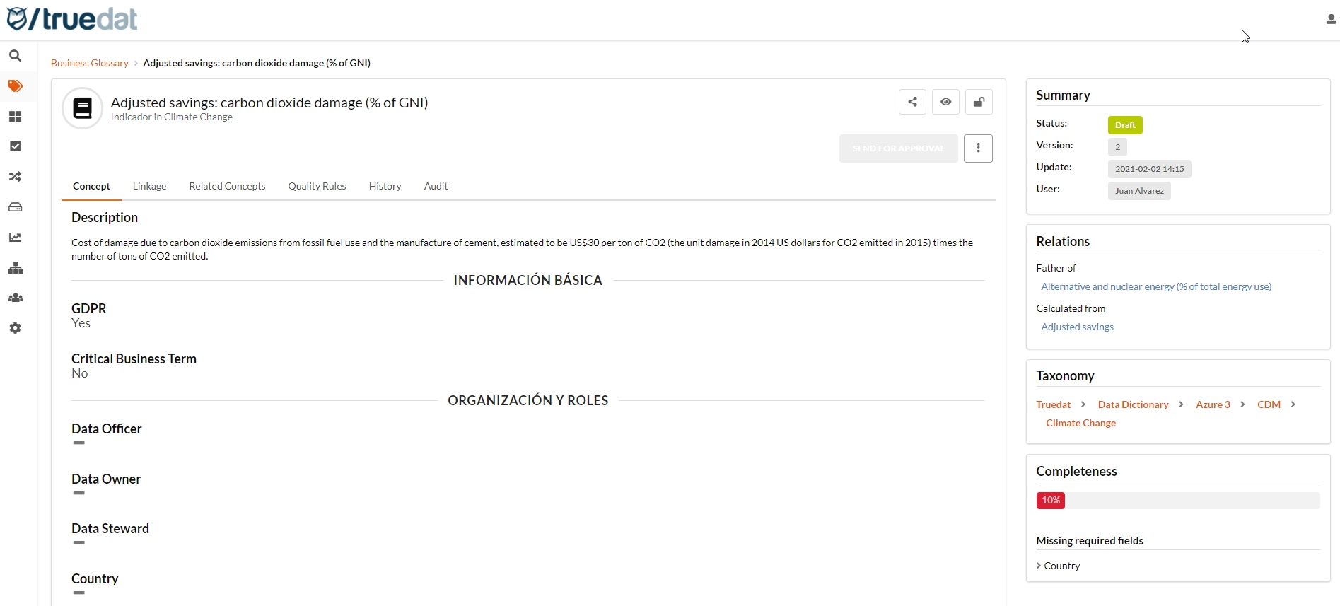 The template may include some additional fields that although not mandatory to be able to publish the concept, they are desirable to have a complete definition of the business concept. Only those concepts where all the mandatory and optional fields are filled in will be shown as 100% completed.