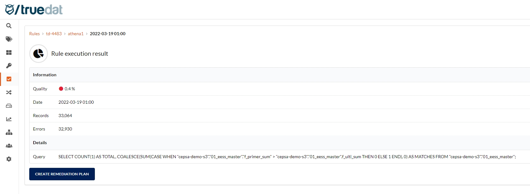 Threshold value: Minimum value resulting from the execution of the rule. Below this value we will consider that a quality error has occurred.