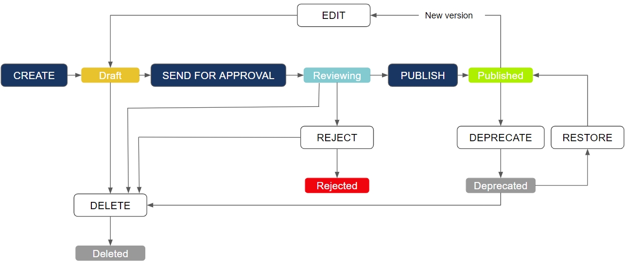 The creation of implementations can go through an approval process. Using the permissions linked to this functionlity, certain roles can be given permissions to create implementations in draft status and send them for approval and a different role can be given the permission to review implementations and approve or reject them.