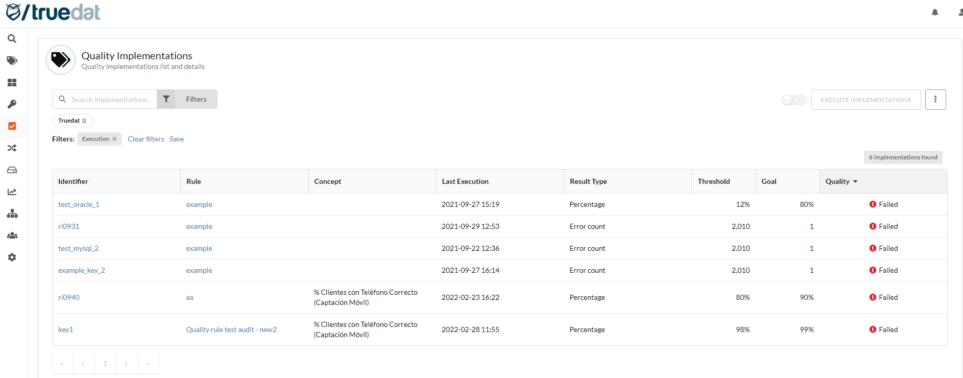 List of all implementations through the sidebar menu with download data, execute quality, search and filter capabilities.