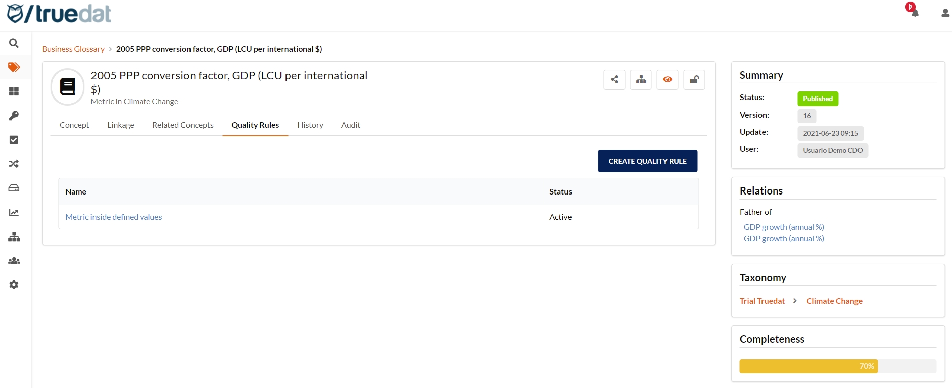 From a business concept. In this case, they will be a functional definition of validations to be performed on the given business concept to ensure its validity. To define these rules, a business concept will be accessed and you will be able to create the rule in the "Quality Rules" tab. Concept and domain will be automatically assigned to the rule.
