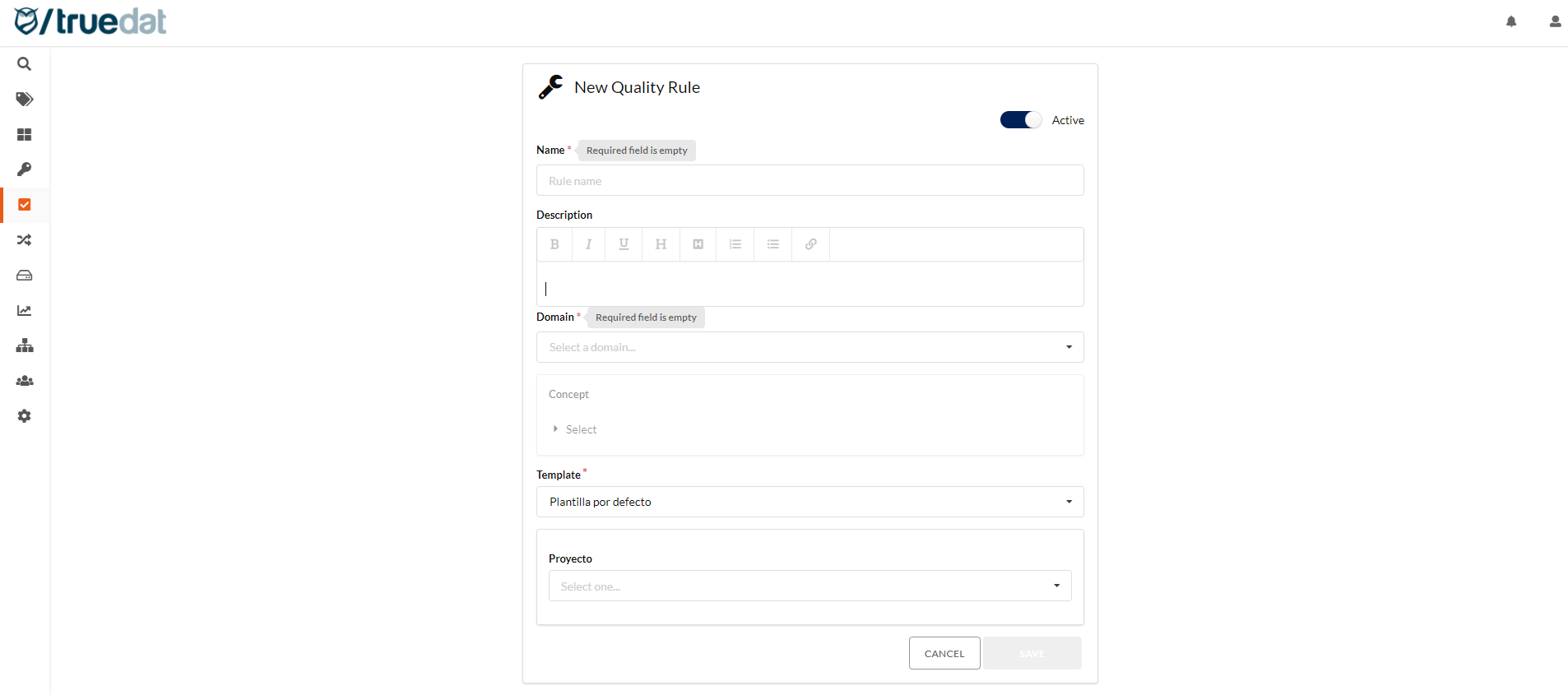 From the Data Quality module: In this case you will need to enter the rule's domain and will be able to select a concept to be linked to the rule although this is optional. In the Data Quality Rules main screen, click on the 'New Quality Rule' button to access the form to enter the rule information.