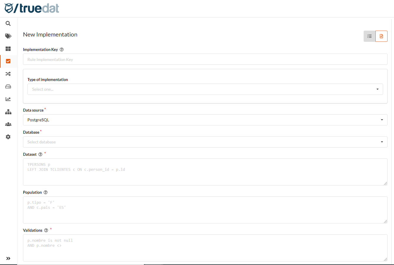 Within the creation of new implementations, depending on the permissions of each user, two types of implementations can be registered: simple implementations that can be created following a multi-step form and raw/native implementations which are usually more complex and are set up by introducing SQL code. Depending on whether the implementation is linked to a rule or not, you will have to go to the Quality Rules menu option or the Implementations menu option.