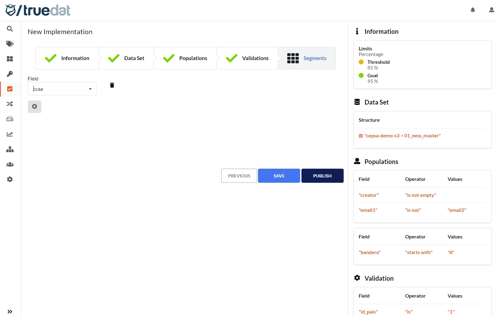 In this step you could define the drill-down criteria so the quality results will be presented not only as a total but also by the segmentation defined. This step is optional and only users with permission "Manage Implementation Segments" will have this option available.