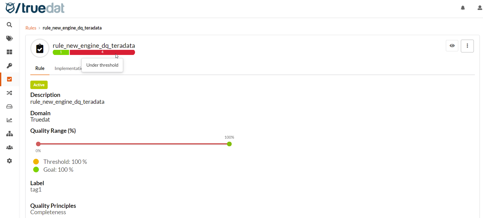 Users will getting a summary of the quality results just bellow the quality rule title. This summary will display the distribution of implementations by latest results. By clicking on the bar users will be able to see the number of implementation in each status.
