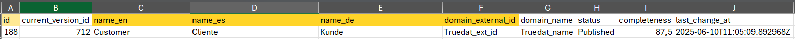 Users with permissions to manage concepts (create/edit business concepts) will be able to download and upload the concept information in multiple languages. The name and all the free text fields from the template that are subject to be translated will be downloaded in separate columns so for each of them there will be as many columns as languages set up in Truedat.
