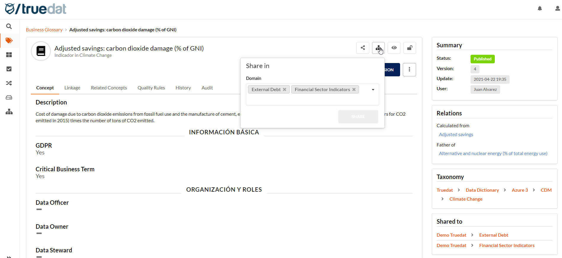 Focused on our installations where information is managed for multiple organizations we have a new feature to share concepts between different domains. Usually when we have a multiorganization we will have a Corporate domain and want that some of our business concepts are used by one or more of our companies. Users with permission to modify a concept will also be able to share this concept with a different domain. This will allow the concept to be seen by anyone with permission on the shared domain and link the concept to any of their data structures.